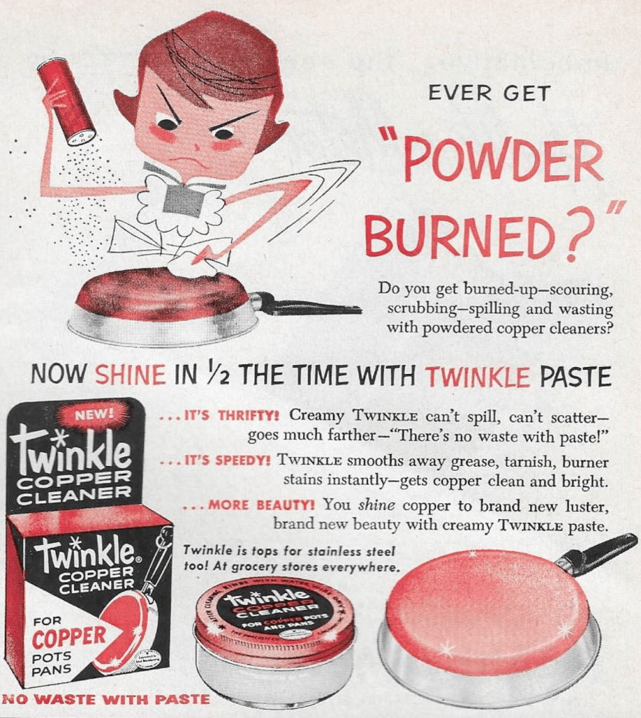 I purchased this ad off Ebay. The only clues to its origin were that it was page 186 and it came from a standard sized (8 1/2 x 11) magazine. This ad was most likely used from 1955-1957. Twinkle Copper Cleaner was a product sold by the Drackett Company. The same company that peddled Windex until it was bought out by S.C. Johnson and Son in 1992.