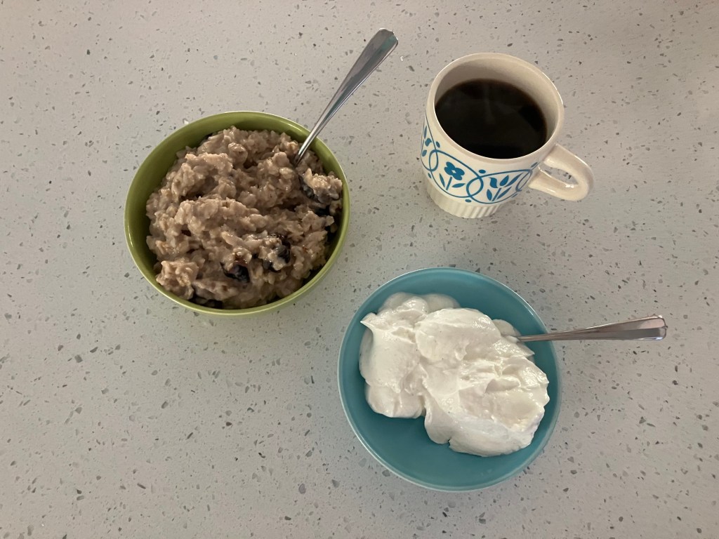 Once the prunes softened and the oatmeal was fully cooked, I added about a tablespoon of honey. I finished the oatmeal, by added a splash of oat milk to cream it up. I enjoyed the oatmeal with a cup of coffee and cup of Siggi’s Icelandic Yogurt for more protein.