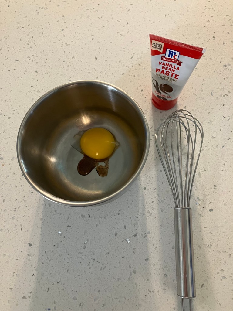 Quickly separate egg, and place only the yolk into a small mixing bowl. Add 1 teaspoon vanilla bean paste to the egg.