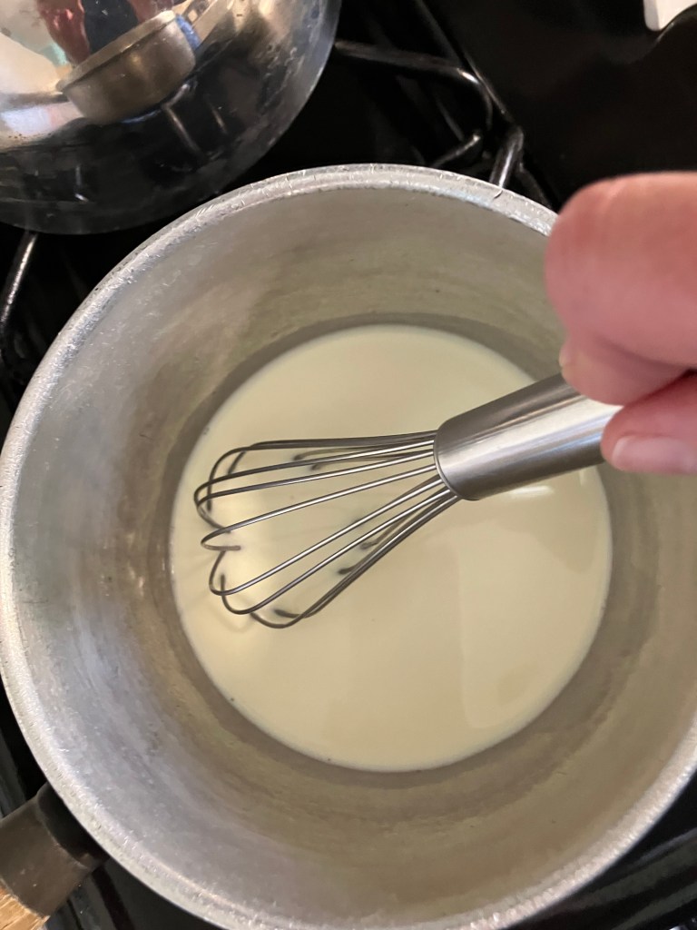In a clean saucepan, heat heavy cream with a 1/2 teaspoon of white granulated sugar. Heat over medium, whisking constantly until it just reaches the boiling point. Remove from heat.