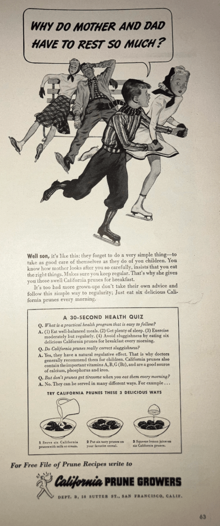 In fact, prunes got such a bad rap throughout the 20th century, marketers changed their name to dried plums in 2001, to get away from just the type of ad you see above. (18 years later in 2019, they changed it back to prunes.)5 Rebranding didn’t work.6