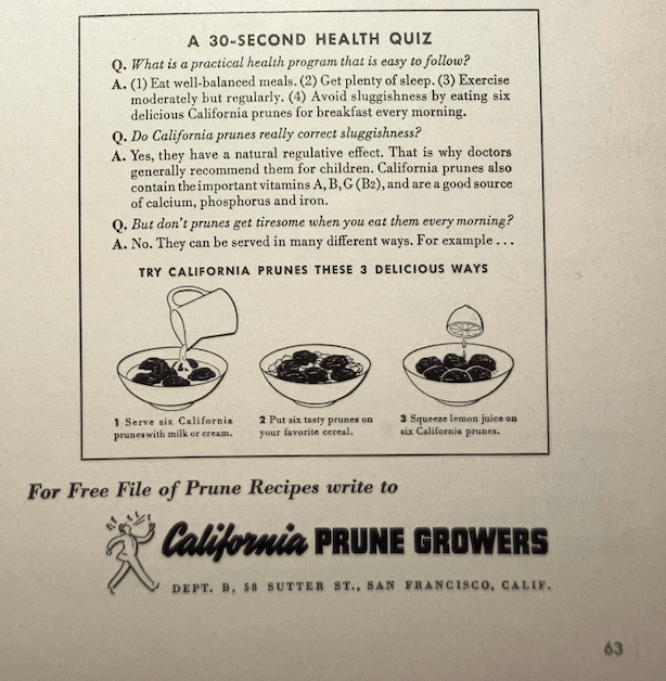 Those poor California Prune Growers. What they’ve had to endure over the years. There really is no great way to sell prunes, is there? They tried their best, especially during the war years, but they had a lot of ground to make up.