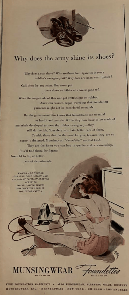 Not enough rubber or nylon4 to make the girdle she’s used to wearing, no matter, she’s got gumption, she’s got that can-do attitude. She can get used to these newer knit fabrics and save the rubber and nylon that would have been used on her girdle to put toward the war effort.