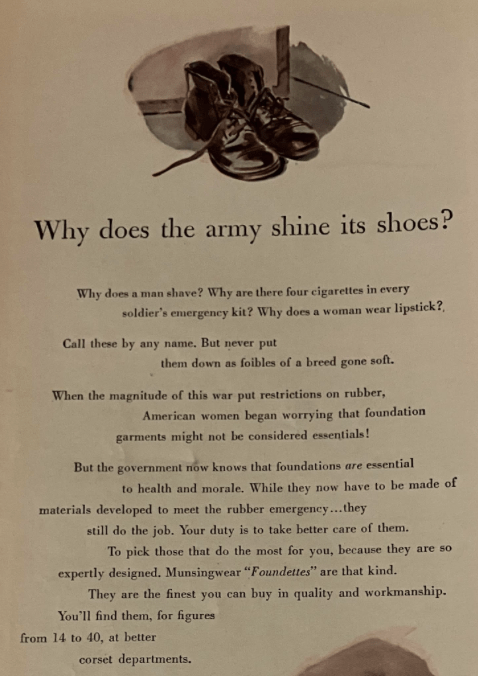Why bother? Why do all this when there is a war on? Because it bolsters humanity. It connects us with who we are and what we value. So why should the reader of Life Magazine care if materials used to make women’s undergarments (rubber and nylon) are considered as part of the essential materials list? Because even during war time, people like to feel attractive.