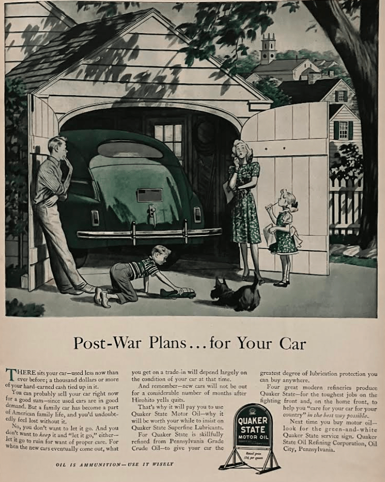 Contemplating using your automobile to get downtown? Better think again and use your own two feet. You won’t be able to replace those tires anytime soon, because rubber is needed for the war, not you. Not to mention wasting gas. Save the car only for emergencies. Ads like this with cars stuck in garages, unable to be used, were common sights: